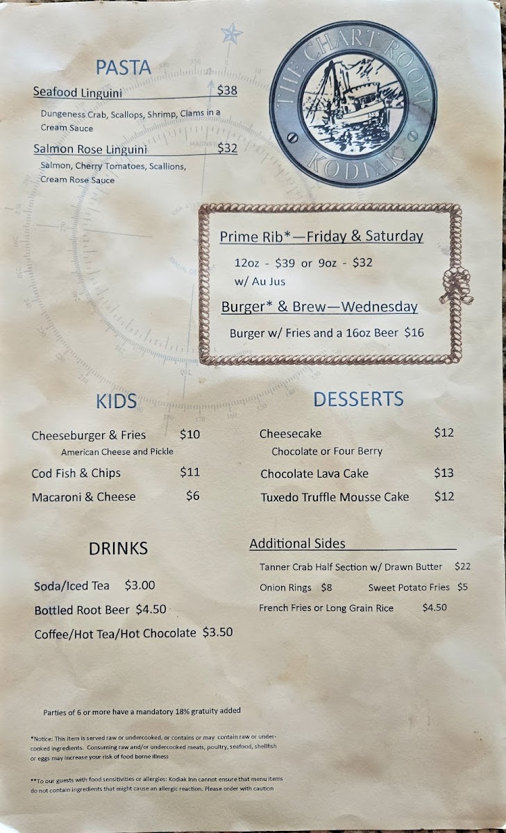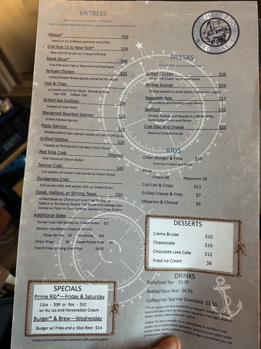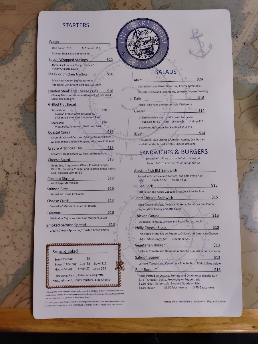 If you’re curious about what to order before stepping inside, the Chart Room Menu gives you a pretty good taste of what to expect at 236 Rezanof Dr W in Kodiak. Sitting right by the water, this spot leans into hearty, satisfying dishes that feel just right after a long day outdoors. You’ll find plenty of local seafood woven throughout the menu - think fresh catches prepared simply, letting the flavors speak for themselves - alongside comforting classics that hit the spot every time.